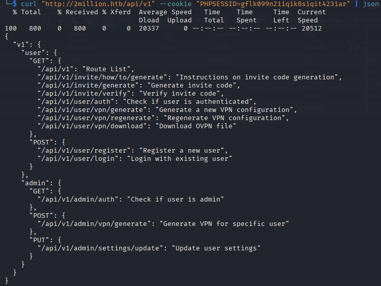 curl "http://2million.htb/api/v1" --cookie "PHPSESSID=gflk099n21iqik8siqit423iar" | json
